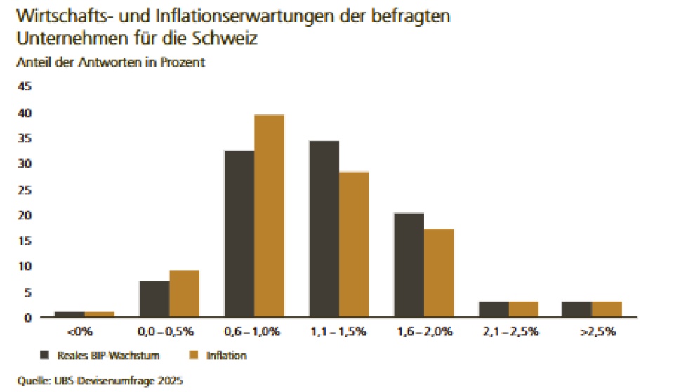 Die Erwartungen an die Wirtschaftsentwicklung sind durchzogen. «Viele Unternehmen gehen davon aus, dass sich das Wirtschaftswachstum in der Schweiz im laufenden Jahr abschwächen wird», erklärte UBS-Ökonomin Meret Mügeli an einer Telefonkonferenz. 40 Prozent der Firmen rechnen für 2025 mit einem BIP-Wachstum von unter einem Prozent. 2024 dürfte sich das Wachstum zwischen 1,1 und 1,5 Prozent bewegt haben (vgl. Abbildung am Schluss).