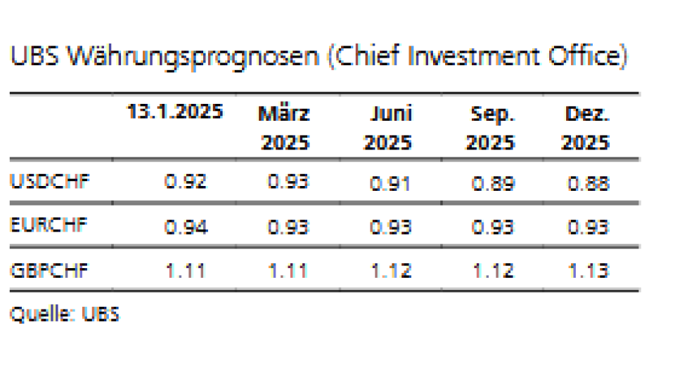 Mit Blick auf die US-Währung lässt die Umfrage einen Wechselkurs von 0,85 Franken pro Dollar erwarten (UBS-Ökonomen: 0,88 verglichen mit aktuell 0,9160 Franken). Das grössere Zinssenkungspotenzial der US-Notenbank im Vergleich zur Schweizerischen Nationalbank (SNB) bleibe der Treiber für die Kursentwicklung. Allerdings werde die Frankenaufwertung weniger stark ausfallen als noch vor dem Wahlsieg von Donald Trump angenommen.