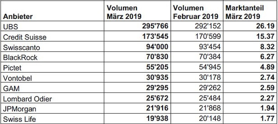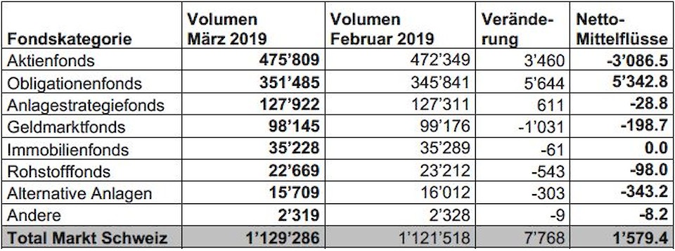Das Vermögen der in der Statistik von Swiss Fund Data und Morningstar erfassten Anlagefonds erreichte im März 2019 1'129.3 Mrd. CHF. Im Vergleich zum Vormonat entspricht dies einer Steigerung von 7.8 Mrd. CHF oder 0.7%. Die Nettomittelzuflüsse betrugen 1.6 Mrd. CHF.