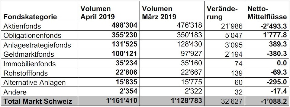 Die Nettomittelabflüsse betrugen im April 2019 -1,1 Mrd. CHF. Am meisten Gelder abgezogen wurden aus Aktienfonds (-2,5 Mrd. CHF), gefolgt von Geldmarktfonds (-380,3 Mio. CHF) und Alternative Anlagen (-295,0 Mio. CHF). Nur zwei Fondskategorien verzeichneten Mittelzuflüsse: Obligationenfonds (1,8 Mrd. CHF) und Anlagestrategiefonds (389,3 Mio. CHF).