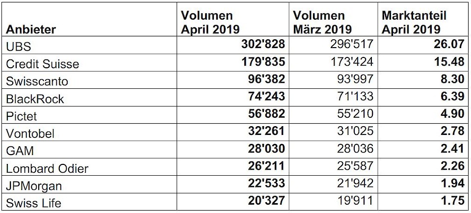 Zum Vergleich ausgewählte Indizes im April 2019 (Vormonat in Klammern): Dow Jones 2,56% (0,05%), S&P 500 3,93% (1,79%), EURO STOXX 50 4,86% (1.62%) und SMI 3,08% (0.95%) sowie SBI -0,28% (1,22%) und Bloomberg Barclays US Aggregate Bond Index 0,03% (1,92%). Gegenüber dem Euro verlor der Schweizer Franken 2,26%, gegenüber dem US-Dollar 2,47%.