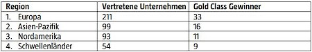 RobecoSAM hat in diesem Jahr insgesamt 69 RobecoSAM Gold Class, 54 RobecoSAM Silver Class und 112 RobecoSAM Bronze Class Auszeichnungen vergeben. Die Region mit den meisten im Yearbook vertretenen Unternehmen ist Europa. Auch gemessen an der Zahl der RobecoSAM Gold Class Auszeichnungen schneiden die europäischen Firmen am besten ab.