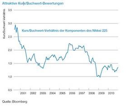 Aus aktuellen Analysen geht hervor, dass mindestens 40%, vielleicht sogar 60%, der an der Tokioter Börse notierten Unternehmen mit einem Kurs/Buchwert-Verhältnis (KBV) von 1,0 oder weniger gehandelt werden. Ein KBV von unter 1,0 ist ein Hinweis darauf, dass die Aktien mit einem Abschlag auf den Wert des Unternehmensvermögens gehandelt werden. Selbst wenn ein Unternehmen offenbar keine Zukunft hat und es deshalb nicht wert ist, am Leben erhalten zu werden, müssten dessen Aktien wenigstens zum Veräusserungswert ihrer Vermögen gehandelt werden. Etablierte Börsenschwergewichte mit funktionierenden Geschäftsmodellen sollten als Unternehmen, die ihre Tätigkeit auf unbestimmte Zeit fortführen, bewertet werden und deshalb mit einem beträchtlichen Aufschlag auf den Buchwert gehandelt werden. So betrug das durchschnittliche KBV des S&P 500 in den vergangenen 30 Jahren 2,4.