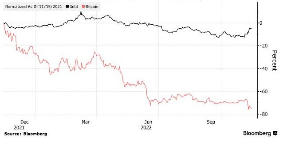 "Bitcoin und überhaupt Kryptowährungen sind das neue Gold." Der Slogan machte vor gut einem Jahr, als weltweit die Inflationsraten in die Höhe schnellten, nicht nur unter Kryptofans, sondern auch in breiten Kreisen des Finanzpublikums die Runde und wurde heftig diskutiert. Kryptowährungen als Diversifikation und Sicherheit gegen Kursabstürze an den traditionellen Märkten, so wie es in früheren Krisen dem Gold zugedacht war. Diese Rolle sollten jetzt die Kryptos übernehmen.