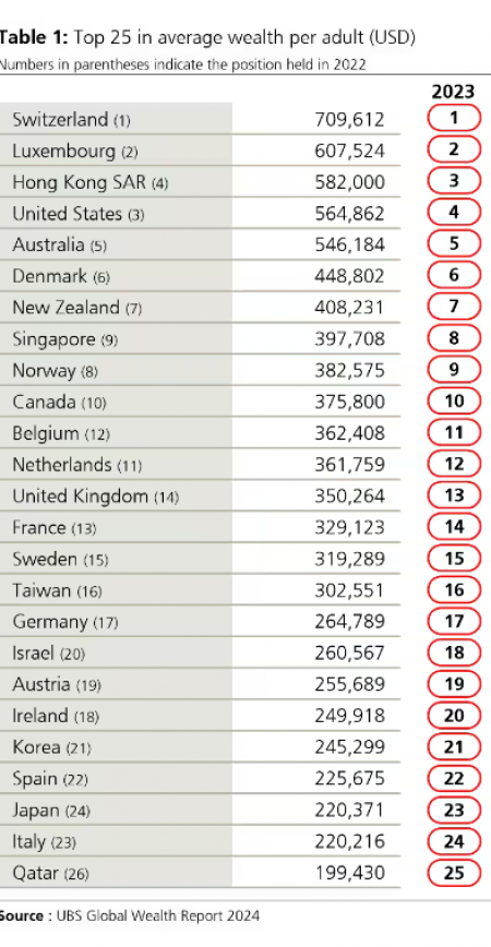 Reichstes Land gemessen am Pro-Kopf-Vermögen pro erwachsene Person 2023 war die Schweiz mit 709'612 US-Dollar. Ihr folgen auf den nächsten Rängen Luxemburg und Hongkong (vgl. Tabelle).