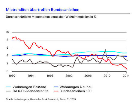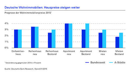 Die weiterhin sehr niedrigen Bauzinsen erleichtern zudem die Finanzierung von Wohnimmobilien. Eva Grunwald, Leiterin Baufinanzierung der Deutschen Bank, erwartet für 2015 keinen wesentlichen Anstieg der Hypothekenzinsen: Erfahrungsgemäß orientieren sich die langfristigen Bauzinsen grob an der Verzinsung deutscher Staatsanleihen. Die Rendite zehnjähriger Bundesanleihen sollte zum Jahresende 2015 mit 0,9% weiterhin extrem niedrig ausfallen. Dies spricht dafür, dass die Bauzinsen für Kunden günstig bleiben dürften."