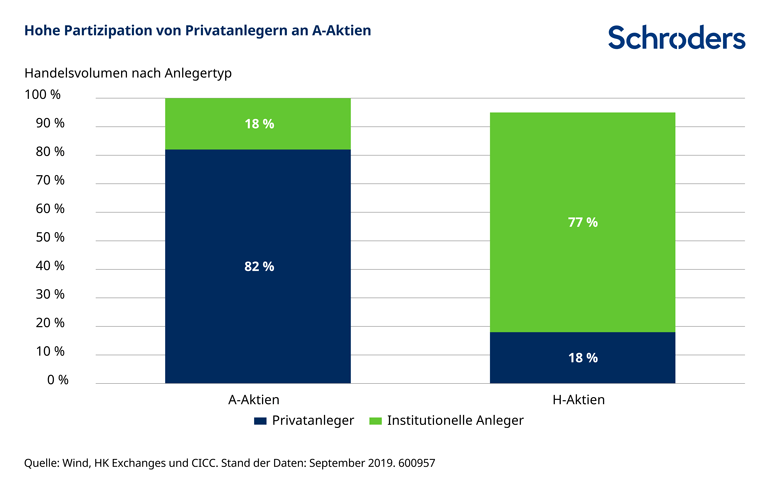 Charakteristisch für den Markt chinesischer A-Aktien sei der hoher Anteil an Privatanlegern, die für über 80% des täglichen Handelsvolumens verantwortlich seien. Dies stehe im Kontrast zum H-Aktienmarkt in der Sonderverwaltungszone Hongkong, der von grossen institutionellen Anlegern mit 77% des Handelsvolumens dominiert werde.