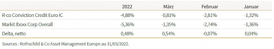 Während die im Januar und Februar mit dem Referenzindex gleichauf lag, erzielte der Fonds im März eine Überperformance von 50 bp. Zurückzuführen ist dies hauptsächlich auf seine Positionierung auf der Zinskurve und auf die Zinsentwicklung. Mit Blick auf die Ratings generierten BBB- und HY-Papiere ohne Rating das gesamte Alpha, während BB-Anleihen einen positiven Beitrag (+65 bp) zur Fondsperformance leisteten.