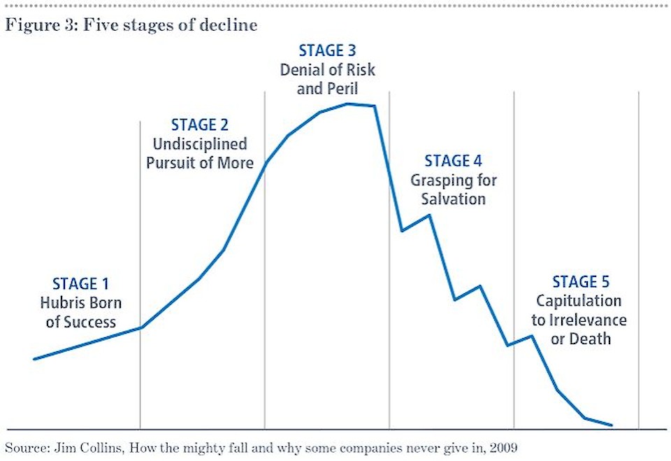 Es ist nicht schwierig, Beispiele für Unternehmen zu finden, deren ausserordentlicher Erfolg sie schlecht auf Veränderungen vorbereitet hat, wie Motorola, wo die Bedrohung durch Blackberry in den 1990er Jahren ignoriert wurde, oder Kodak, wo der Paradigmenwechsel zur Digitalfotografie nicht erkannt wurde. Das Bewusstsein über die Gefahr des ‚Pfads zum Niedergang‘ (Collins) kann dazu beitragen, ein gesünderes Unternehmen zu formen, wenn jeder sich darüber im Klaren ist, dass Erfolg vorübergehender Natur sein kann und dass das Super-Projekt von gestern möglicherweise auch der Schnee von gestern ist.