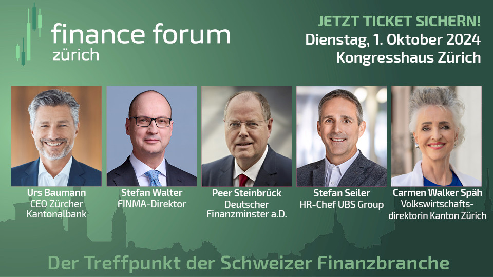 Am 1. Oktober 2024 trifft sich die Schweizer Finanzbranche erneut am Finance Forum Zürich. Hochkarätige Gäste wie ZKB-CEO Urs Baumann, Ex-Finanzminister Peer Steinbrück, FINMA-Direktor Stefan Walter und UBS-HR-Chef Stefan Seiler diskutieren über die Zukunft des Finanzplatzes Schweiz.