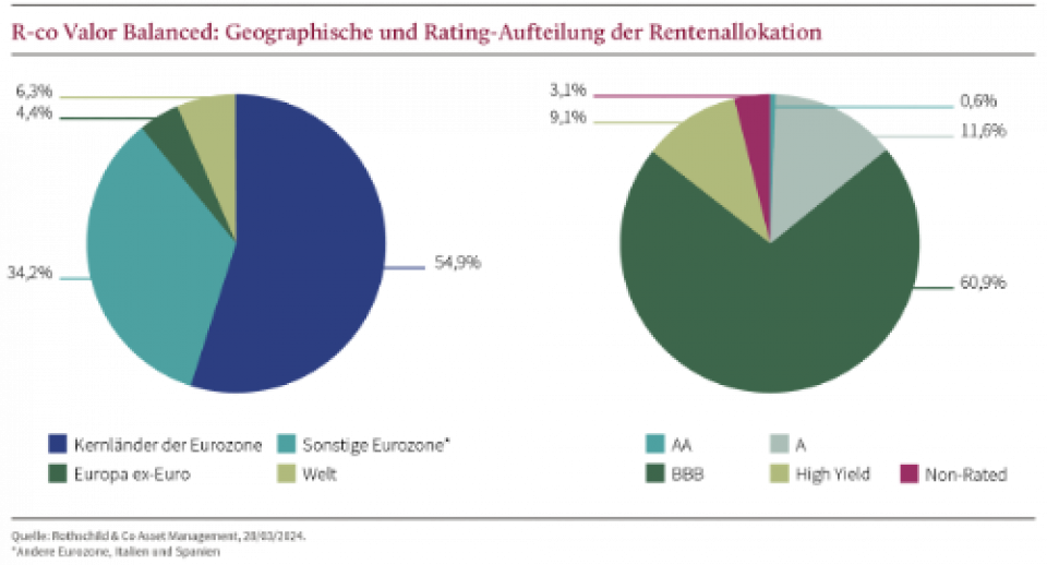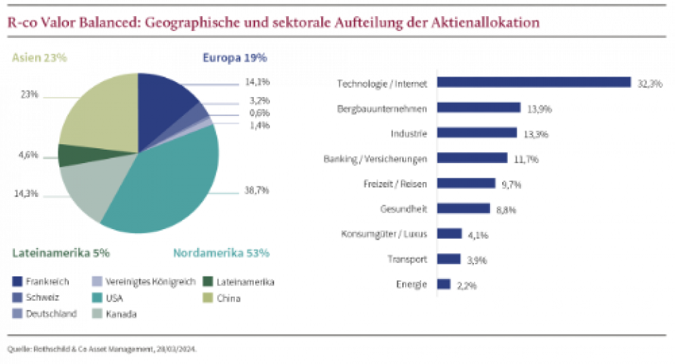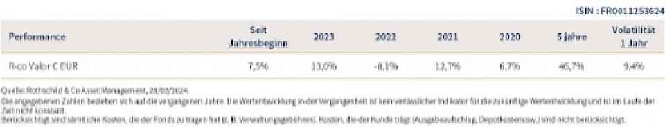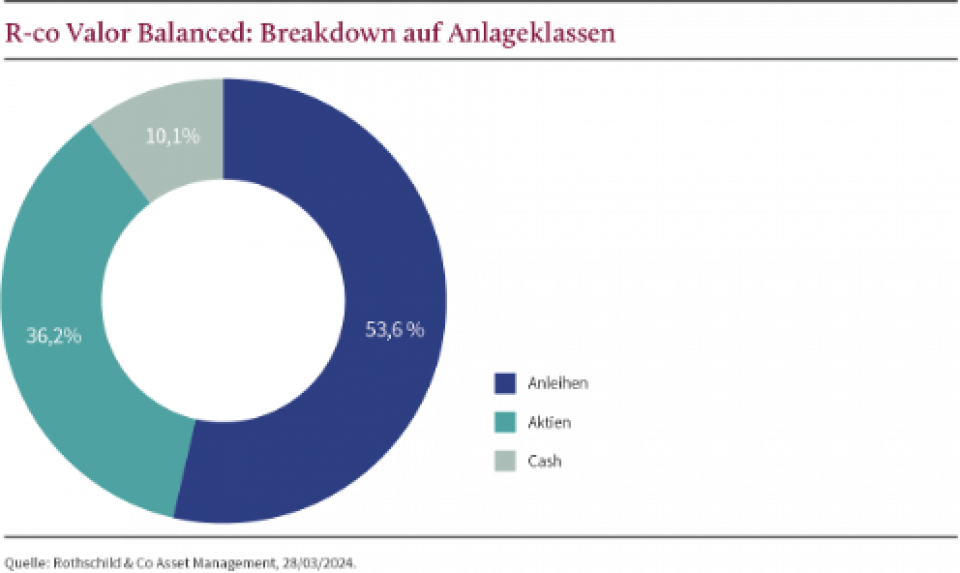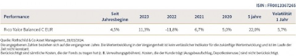 Ende März lag das Aktienexposure des R-co Valor Balanced bei 37%, während der Anteil der Anleihen 54% ausmachte. Der Rest des Fondsvermögens war in Geldmarktinstrumente und geldnahe Anlagen investiert. Der Fonds stieg im Berichtsquartal um +4,5%. Aktien leisteten vor allem nach dem guten Lauf der Tech- Werte den höchsten Performancebeitrag. Trotz der höheren Zinsen, die Investment Grade Papiere seit Jahresbeginn belasten lieferten Anleihen ebenfalls einen leicht positiven Performancebeitrag.