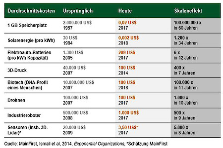 Obwohl die Leistung zunimmt, sinken die Produktionskosten. Dies beschleunigt den Fortschritt weiter. Dass die Speicherkapazität von Chips mittlerweile viele Gigabyte beträgt, ist einer der Gründe, warum wir heute auf unserem Telefon mehr speichern können als vor 15 Jahren auf einem viel grösseren Desktop-PC. Die Entwicklungen bei vielen anderen Innovationen wie die Batterien von Elektroautos oder der 3D-Druck stehen erst am Anfang und haben noch viel Potenzial, Veränderungen und Wachstum voranzutreiben.
