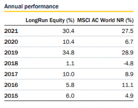 Important information Risk Factors to Consider Before Investing: The value of the shares and the resulting income may fall as well as rise. The investor may receive upon the redemption of its shares an amount less than that originally invested. Investing at the international level can bring additional returns and diversify risks. However, fluctuations in exchange rates may have a positive or negative effect on the value of your investment. The SICAV may make use of financial derivative instruments for hedging purposes which can involve significant risks of loss. Complete information on risks relevant to the SICAV can be found in the prospectus. Risk indicator information: This indicator represents the annual historical volatility of the Fund over a 5-year period. Lack of sufficient data, the risk indicator incorporates simulated data from a benchmark portfolio. Risk Category 5 reflects high potential gains and/or losses for the portfolio. This is due to investments in equities without geographic restraints. Historical data such as that used to calculate the synthetic indicator cannot be considered as a reliable indication of the Fund’s future risk profile. The risk category associated with the Fund is not guaranteed and may change over time. The lowest risk category does not mean »risk free”. Your initial investment is not guaranteed. Other Important Information: LongRun Equity Fund is a UCITS fund incorporated under the law of Luxembourg incorporated as a public limited company and structured as an open-ended investment company (»SICAV”). This marketing communication is issued by LongRun Equity Fund, domiciled at 5, allée Scheffer, L-2520 Luxembourg and authorized by the CSSF. LongRun Equity Fund has the right to modify or make corrections to the information contained in this document at any time and without prior notice. This document has been made on a best-efforts basis and is furnished for information purposes only and does not constitute an offer or a recommendation to purchase or sell any security, unless otherwise provided for in the present disclaimer. The opinions herein do not take into account individual clients’ circumstances, objectives, or needs. Each client must make their own independent decisions regarding any securities or financial instruments mentioned herein. Before entering into any transaction, each client is urged to consider the suitability of the transaction in relation to their particular circumstances and to independently review, with professional advisors as necessary, the specific risks incurred, in particular at the financial, regulatory and tax levels. The tax treatment depends on the circumstances of each investor and may change. Investors should get advice from a professional before making any investment decision. This document is confidential and is intended only for the use of the person to whom it was delivered. This document may not be reproduced (in whole or in part) or delivered to any other person without the prior written approval of LongRun Equity Fund. This document is not intended for distribution or use by any person, whether natural or legal, resident or resident in a country in which its distribution, publication or use is prohibited. It is the responsibility of every recipient to inform themselves and observe applicable regulations and restrictions in their jurisdiction. The SICAV is not Registered under the United States Securities Act of 1933 or under the United States Investment Companies Act of 1940. Accordingly, the Fund may not be offered or sold, directly or indirectly, in the United States of America or in its States, Territories, Possessions or other areas subject to its jurisdiction or to a United States person. The information, notices or data contained in this document do not constitute investment advice, nor are they of a legal, tax or other nature and should not be considered as such when making investment or other decisions. Subscriptions in the SICAV may only be made on the basis of the latest prospectus the articles of incorporation (available in English and French), the Key Investor Information Document (KIID) (available in English, French and Spanish), the most recent annual and semi-annual reports (available in English), a copy of which may be obtained free of charge on request by contacting Luxcellence Management Company SA (the »Management Company”) or be downloaded from www. luxcellence.com. A summary of investor rights is available at www.luxcellence.com. This summary is available in English. Investors should note that the Management Company may, in accordance with Article 93a of Directive 2009/65/EC (the »UCITS Directive”), decide at any time to terminate the arrangements made for marketing the fund in any country where it has been notified for marketing. Additional Information for Swiss Investors: The Swiss representative is ACOLIN Fund Services, Leutschenbachstrasse 50, 8050 Zurich. The Swiss paying agent is CACEIS Bank, Paris, succursale de Nyon/Suisse, Route de Signy, 35, 1260 Nyon. A copy of the prospectus, the KIID, the annual and semi-annual reports of the SICAV may also be obtained free of charge on request in Switzerland from the Swiss representative. Additional Information for French Investors: A copy of the prospectus, the KIID, the annual and semi-annual reports of the SICAV may also be obtained free of charge on request in France to our French centralizing agent, Caceis Bank France, 1-3, Place Valhubert – 75013 Paris. Investors should note that, relative to the expectations of the Autorité des Marchés Financiers, this UCITS presents disproportionate communication on the consideration of non-financial criteria in its investment policy. Performance refers to the past and is not a reliable indicator of future performance.