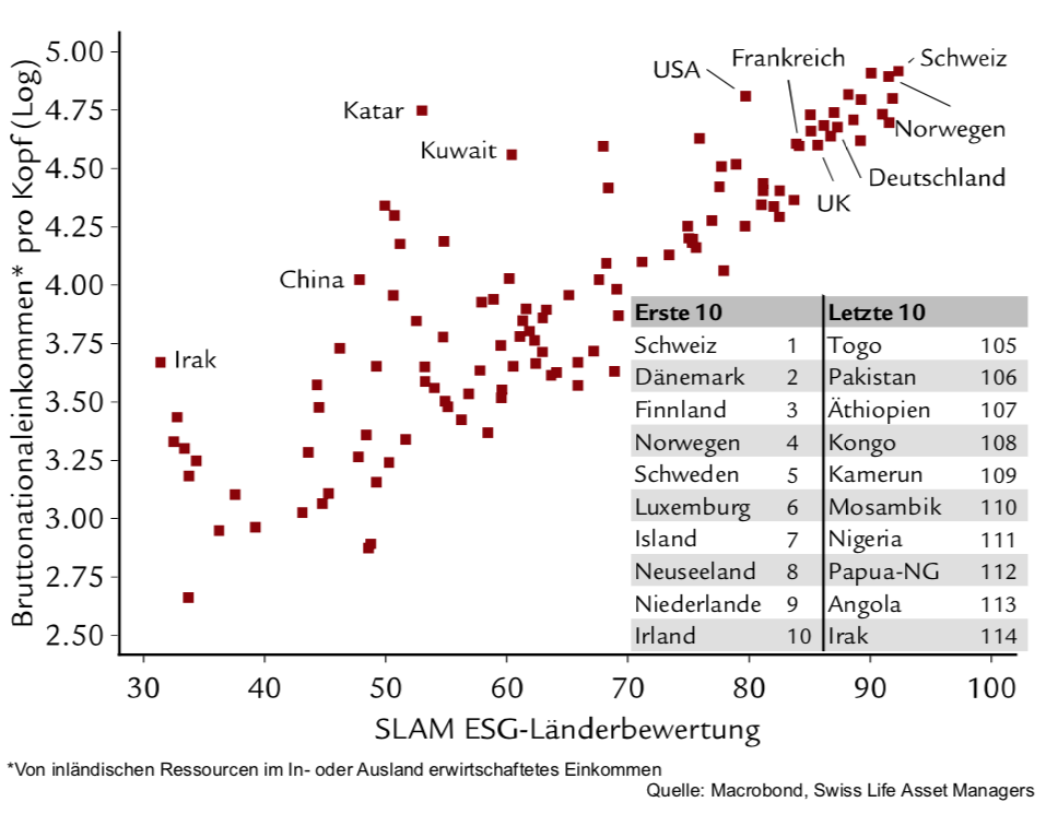 Die jüngste Aktualisierung der hauseigenen ESG-Bewertung (Umwelt, Soziales und Governance) von Swiss Life Asset Managers für 114 Länder zeigt die Schweiz auf Rang eins, gefolgt von Dänemark. Schlusslichter sind der Irak und Angola. Der ESG-Wert korreliert stark mit herkömmlichen wirtschaftlichen Massen wie dem Bruttonationaleinkommen (BNE)* pro Kopf (vgl. Grafik). Dabei steche jedoch heraus, dass vor allem bekannte Ölstaaten, aber auch China, die Türkei und die USA in Relation zu ihrem BNE einen relativ tiefen ESG-Wert aufweisen. Im Vergleich zu anderen entwickelten Ländern schneiden die USA insbesondere im Bereich Soziales schlecht ab, etwa bezüglich Diskriminierung von Minderheiten sowie Zugang zu Bildung und Gesundheit.