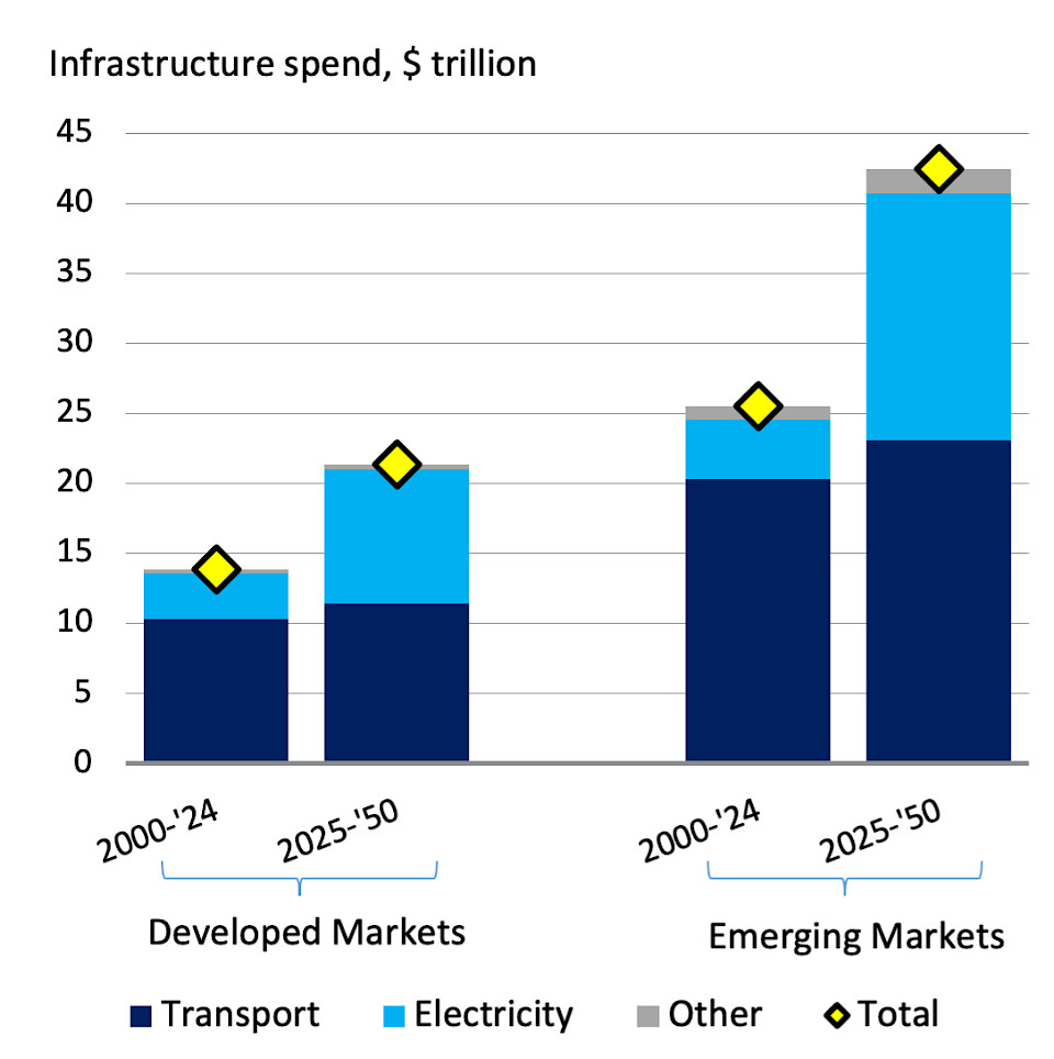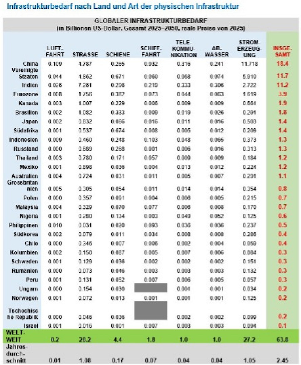 Dies entspricht laut einer Mitteilung 1,7 Prozent des weltweiten BIP pro Jahr und liegt fast zwei Drittel über den 39 Billionen US-Dollar, die zwischen 2000 und 2024 für Infrastrukturinvestitionen ausgegeben wurden.