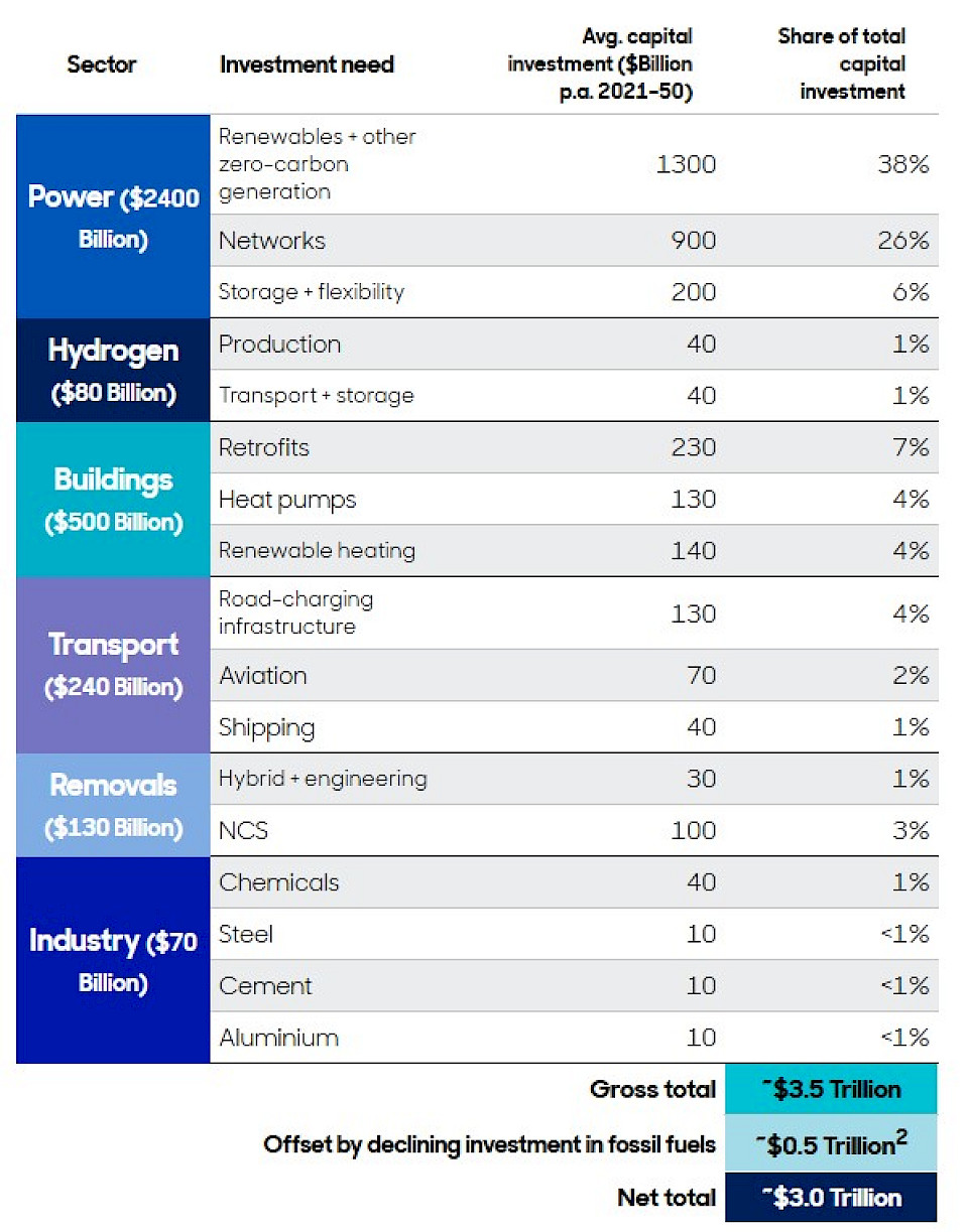 Und dann sei da noch das Streben nach sauberer Energie. Wie unten dargestellt, werden Billionen von Dollar an Investitionen in mehreren emissionsintensiven Sektoren erforderlich sein, um die von vielen Regierungen und Unternehmen gesetzten Netto-Null-Kohlenstoffziele zu erreichen.