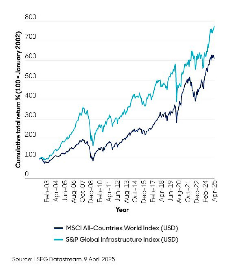 Der Trump'sche Zollschock hat weltweit zu erheblichen Marktverwerfungen geführt. Die Anleger orientieren sich nun naturgemäss auf sichere Anlagen, die inmitten all der Volatilität ein gewisses Mass an Stabilität bieten können. «Wir sind der Meinung, dass die Infrastruktur viele Kriterien erfüllt und in der turbulenten Welt von heute eine solide Grundlage bietet», schreibt Josh Duitz von Aberdeen.