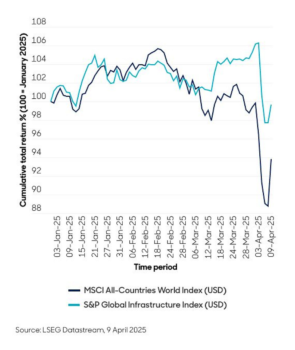Wie erläutert, liegt ein besonderer Vorteil von Infrastrukturanlagen in ihrer relativen Sicherheit in Zeiten erhöhter Marktvolatilität. Wie unten dargestellt, haben sich globale Infrastruktur-Aktien in Zeiten erheblicher zollbedingter Umwälzungen (bisher) als widerstandsfähiger erwiesen.