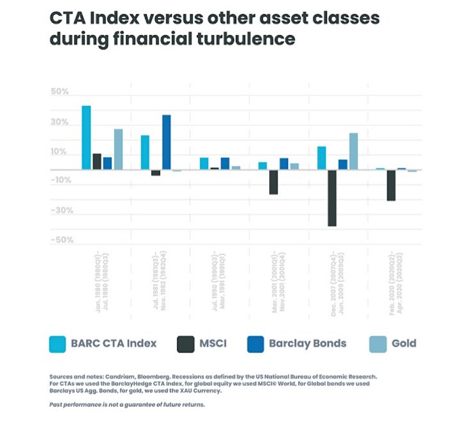 «Eine stagnierende absolute Performance in Rezessionsphasen zeigt: In der Vergangenheit erzielten CTAs in Zeiten von Rezessionen positive Erträge und konnten mit einer Anleihenallokation mithalten. Dabei waren sie beständiger als Gold.» Das Edelmetall zeigte überraschenderweise in mehreren dieser Phasen Verluste. Insofern lässt sich sehr wohl infrage stellen, ob sein Ruf als «sicherer Hafen» noch gerechtfertigt ist. Doch dies ist nur ein Randergebnis dieser Analyse. Ziel war es, die historische Funktion einer CTA-Allokation in einem diversifizierten Portfolio zu untersuchen. Hier bietet sich ein interessantes Bild.