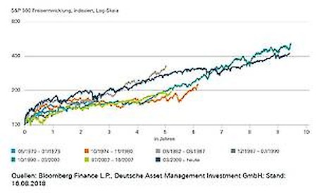 Wie David Bianco, CIO Americas bei der DWS, bemerkt, war der Bärenmarkt von 1990 mit einem Rückgang von knapp unter 20 Prozent übrigens ein sehr kleiner Bär. Man könnte auch behaupten,dass der Bullenmarkt der 90er Jahre bereits nach dem Crash von 1987 begann. Nach dieser Definition müssten wir uns aber noch bis Juni 2021 gedulden, bis der aktuelle Bullenmarkt auch diesen Rekord einstellen wird.