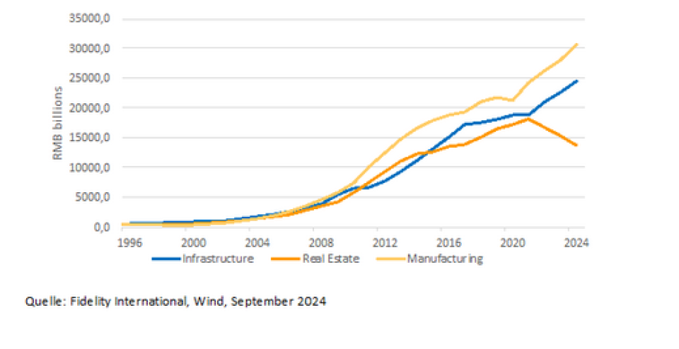 Historisch war Chinas Wachstum massgeblich von seiner Funktion als «Werkstatt der Welt» geprägt. Hohe Investitionen und ein grosses Arbeitskräftepotenzial trieben eine lange Phase exportorientierten Wachstums an. Die Nachfrage nach Immobilien, Infrastruktur und Konsumgütern stieg und es bildete sich eine wachsende Mittelschicht.