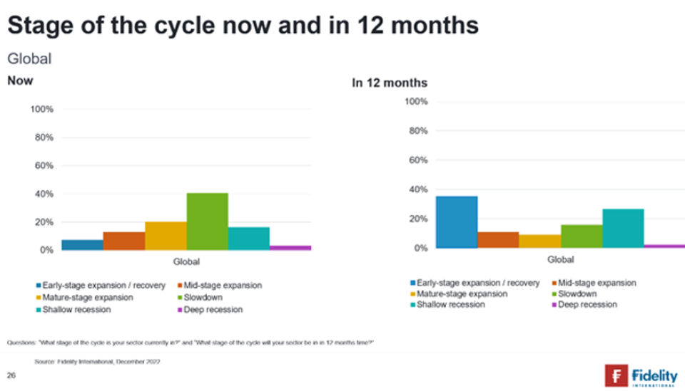 Fragen: «In welcher Zyklusphase befindet sich Ihre Branche derzeit?» und «In welcher Zyklusphase wird sich Ihre Branche in zwölf Monaten befinden?» Die Grafik gibt jeweils den prozentualen Anteil der Analysten an. Quelle: Fidelity Analysten-Umfrage 2023