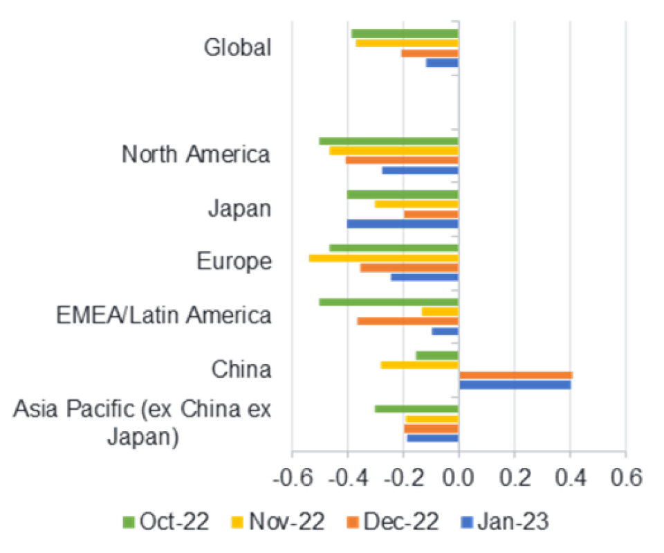 Frage: «Hat sich anhand Ihrer Interaktionen mit Unternehmen im letzten Monat Ihre Wahrnehmung zur Stimmung der Firmenentscheider mit Blick auf die kommenden sechs Monate verändert und wenn ja, wie stark?» Die Grafik zeigt den Anteil der Analysten, aus deren Antworten eine positive Stimmung der Unternehmenslenker hervorgeht, abzüglich jener, die über eine negative Stimmung in den Vorstandsetagen berichten. Stark negative und stark positive Antworten wurden doppelt gewichtet. Höhere Werte zeigen an, dass die Analysten insgesamt über eine positivere Stimmung bei den von ihnen beobachteten Unternehmen berichten, niedrigere Werte stehen für eine eher negative Stimmung. Quelle: Fidelity International Analysten-Umfrage 2023