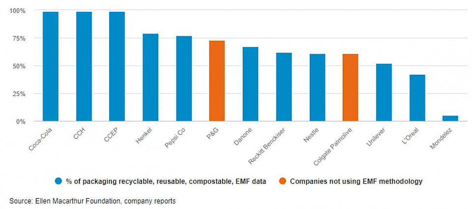 Obwohl er die Ellen MacArthur Commitments nicht unterzeichnet habe, zeige der weltgrösste FMCG-Konzern Procter&Gamble einen durchdachten Ansatz bei der Festlegung und Umsetzung von Zielen für die Kreislauffähigkeit von Verpackungen.