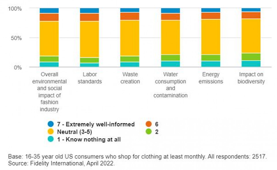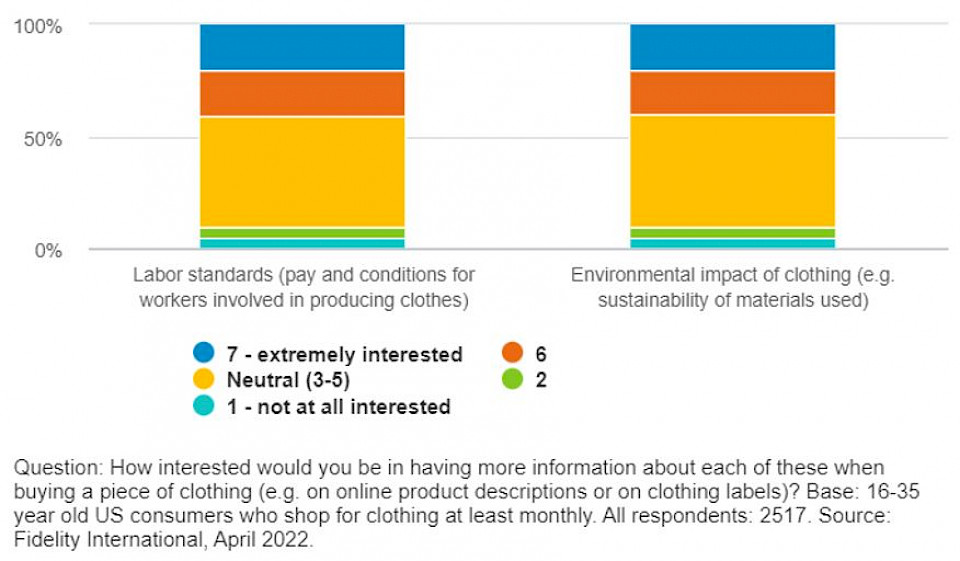 Fidelity International hat Ende letzten Jahres eine Umfrage unter US-amerikanischen Verbrauchern im Alter von 16 bis 35 Jahren durchgeführt. Die Ergebnisse zeigen, dass sich die meisten Verbraucher aufgrund fehlender Standardisierung oder Transparenz in Bezug auf Nachhaltigkeit in der Modebranche schlecht über die ökologischen und sozialen Auswirkungen der Modebranche informiert fühlen. Rund 40% der Befragten gaben an, dass sie beim Kauf von Kleidung sehr daran interessiert wären, mehr Informationen über Arbeitsstandards und Umweltauswirkungen zu erhalten.