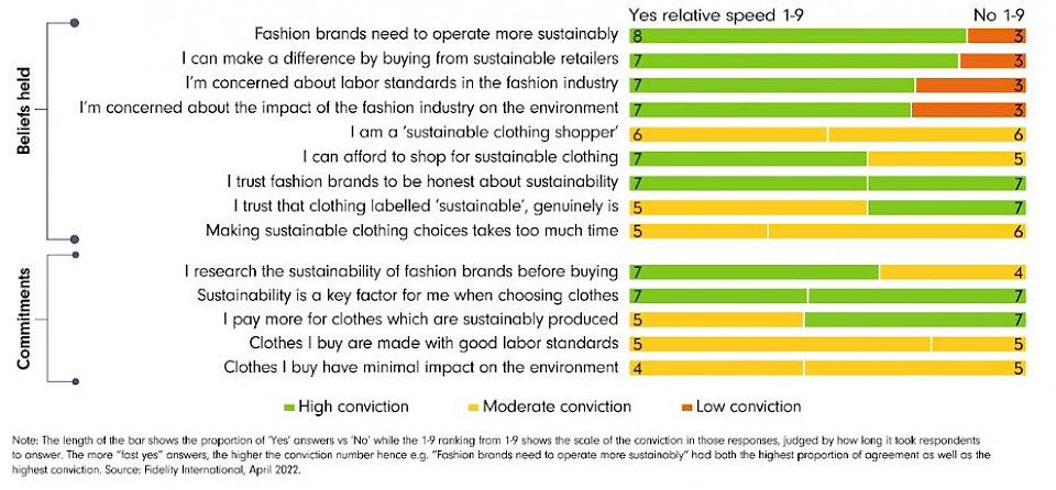 Was steckt hinter einem Etikett? Fidelity nutzte spezielle Reaktionszeittests, um die grundlegende Einstellung der Modekonsumenten zu ermitteln. Die Ergebnisse deuten darauf hin, dass klarere und standardisierte Signale in Bezug auf Nachhaltigkeit eine Rolle spielen könnten, um das Kaufverhalten zu ändern.