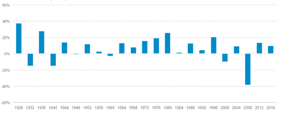 Quelle: S&P Dow Jones Indices LLC. Das Diagramm zeigt die S&P 500-Kalenderjahr-Kursrenditen in den US-Präsidentschaftswahljahren zwischen 1928 und 2016. Die Daten beginnen am 3. Januar 1928. Fidelity International, August 2024.