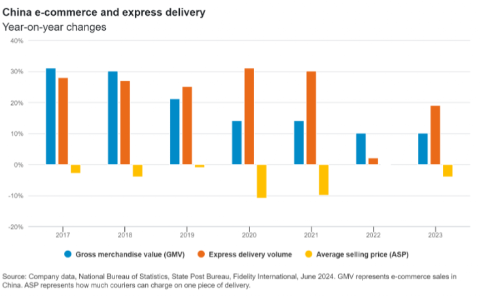 Die Antwort liegt laut Fidelity im durchschnittlichen Verkaufspreis (ASP) - wie viel die Kuriere für eine Lieferung verlangen können. «Diese Zahl ist seit über einem Jahrzehnt im Minus, weil sich die Kuriere einen harten Preiskrieg geliefert haben. Der Erfolg des chinesischen E-Commerce bedeutete, dass jeder in der Expresszustellung ein Stück des wachsenden Kuchens haben wollte. Das einzige Jahr, in dem ASP nicht an Boden verlor, war 2022, als die Regulierungsbehörde eingriff und die Unternehmen zu einem Waffenstillstand zwang - mit etwas Hilfe von Zero-Covid-Lockdowns», erläutern die Experten.