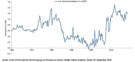 Aumiller erwähnt Brandywine Global, das in seinem jüngst in "Around The Curve" erschienenen Artikel in "EM Bonds: Your Coupon, Our Challenge" darauf hinweist, dass die Erträge von US-Investoren aus Schwellenländer-Anleihen zum raschen Anstieg des Nettoertragssaldos aus dem Ausland beigetragen haben - also Zahlungen, die sowohl in die USA als auch aus den USA heraus fliessen. Diese Entwicklung ist seit dem Aufkommen verstärkter Investitionen in Nicht-US-Anleihen seit 2010 besonders deutlich zu beobachten (siehe Grafik).