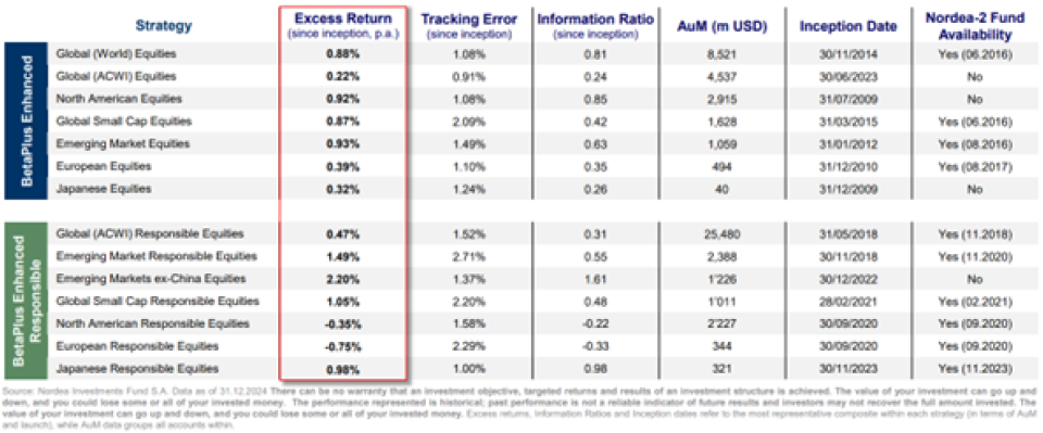 Nordea BetaPlus wurde bereits 2009 lanciert. Die Produktlinie ist eine Antwort auf passives Anlegen und bietet das Beste aus der Welt der passiven und der aktiven Anlagen. Im Unterschied zu klassischen Indexfonds bilden BetaPlus-Strategien nicht nur eins zu eins einen Vergleichsindex ab, sondern haben zum Ziel, eine Überrendite und damit Mehrwert für die Anleger zu erzielen. Gleichzeitig wird das aktive Risiko durch den angestrebten Tracking Error von 1 Prozent2 tief gehalten.