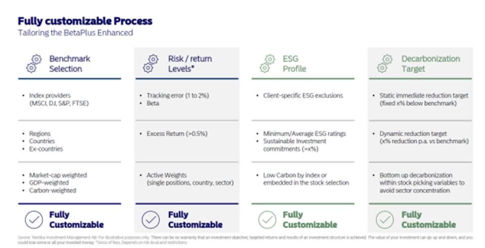 Im Rahmen dieses Kooperationspartnermodells erhalten beispielsweise CIOs und Portfoliomanager Zugang zu verschiedenen Bausteinen, welche flexibel eingesetzt werden können, sowie auch zu einer weiteren, exklusiven Anteilsklasse (I3-Klasse). Darüber hinaus bietet NAM massgeschneiderte Lösungen rund um die BetaPlus-Produktlinie an. Kunden können beispielsweise den Indexprovider, die abgedeckten Regionen und Länder oder den konkreten Ansatz – beispielsweise BIP-gewichtet oder marktgewichtet – frei wählen. Wahlmöglichkeiten bestehen auch mit Blick auf den Tracking Error – zwischen 1 und 2 Prozent – und besondere ESG-Wünsche. «Unsere Kernkompetenz ist und bleibt das Thema Klima und Dekarbonisierung. In diesem Bereich sind wir in Europa führend. Entsprechend können wir BetaPlus sehr flexibel an den Dekarbonisierungszielen unserer Kunden ausrichten», erklärt Pappone.