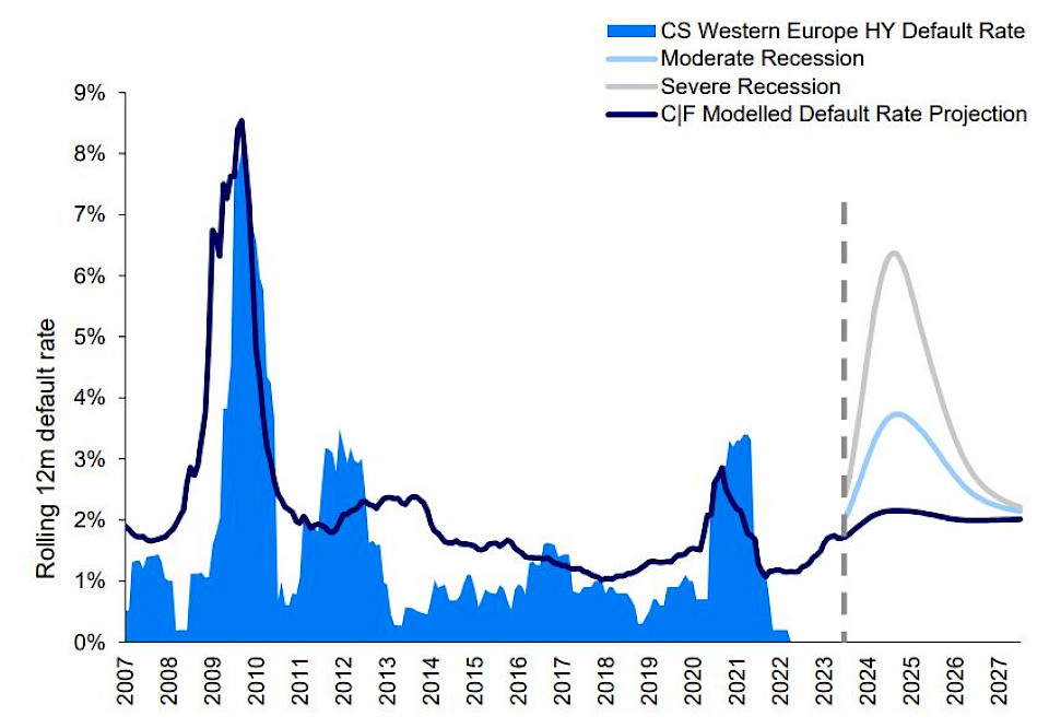 Capital Fours Modelle prognostizieren für den europäischen High-Yield-Markt einen Höhepunkt der Ausfallrate von 2,25 bis 2,5 Prozent in den nächsten 12 bis 24 Monaten. Sollte entgegen aktueller Annahmen die Rezession moderat oder sogar schwer ausfallen, könnten die Ausfallraten jedoch auf knapp 4 beziehungsweise 6,5 Prozent klettern. Bei den europäischen Leveraged Loans dürfte der Peak bei 3 Prozent bis 3,5 Prozent liegen.