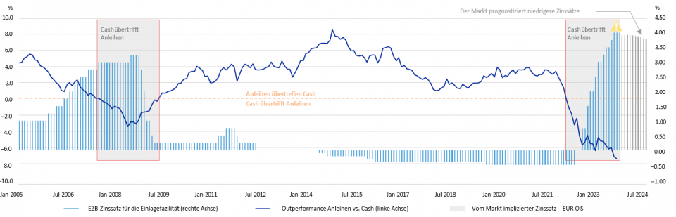 Quelle: Bloomberg. Stand: 30.12.2023. Rechte Achse = der offizielle Zinssatz für die Einlagenfazilität der EZB. Linke Achse = Die rollierende 3-Jahres- Überschussrendite des Bloomberg EuroAgg Total Return Index Value Unhedged EUR gegenüber dem Euribor 3M. Die schattierten Bereiche zeigen den Zeitraum, in dem Cash besser abgeschnitten hat als Anleihen.