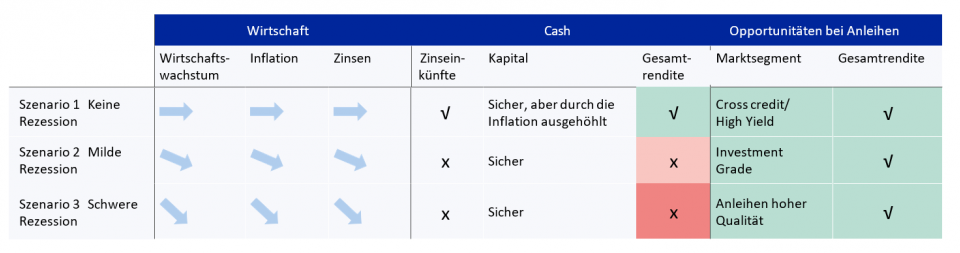 Das dritte Szenario ist eine schwerere Rezession mit stärkeren Rückgängen des Wirtschaftswachstums, der Inflation und auch der Zinssätze. Sinkende Zinsen werden sich sowohl auf Bargeld als auch auf Anleihenbestände auswirken. Gleichzeitig werden die Anleihepreise steigen, wenn die Renditen sinken – insbesondere bei Anleihen mit längerer Laufzeit. Dies wird die sinkenden Renditen ausgleichen und dazu führen, dass Anleihen auch in diesem Szenario besser abschneiden als Cash. In einer ausgewachsenen Rezession werden qualitativ hochwertige Anleihen mit höherer Duration – Staatsanleihen, gedeckte Anleihen (Pfandbriefe) und Unternehmensanleihen höchster Qualität – am ehesten die Renditen liefern, die Anleger suchen.