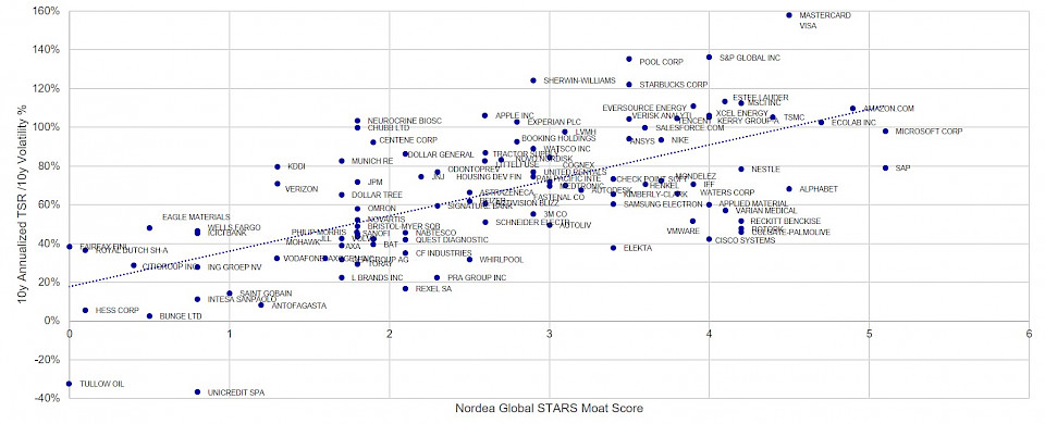 Für Ahlberg müssen Unternehmen über klare und gut geschützte Wettbewerbsvorteile in ihren Märkten verfügen. Diese werden anhand von sechs Kriterien wie beispielsweise Preissetzungsmacht, Wechselkosten, Skalen- oder Netzwerkeffekte in einem Moat-Score abgebildet. Moat steht dabei für den Burggraben, der die mittelalterlichen Festungen schützte. In den Score fliessen auch mögliche Risiken durch Regulierung oder Disruption ein.