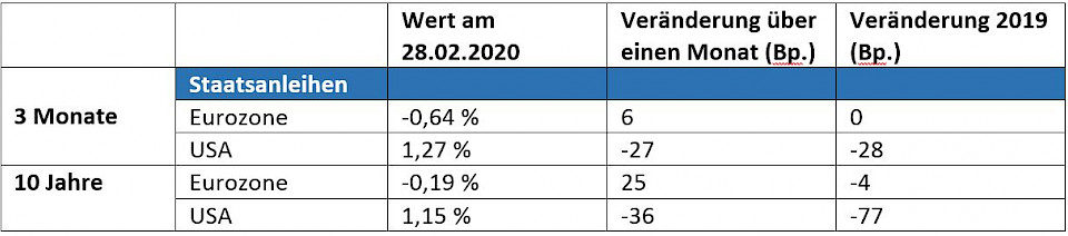 Nach den Massnahmen der Fed betonten andere Zentralbanker, dass sie nicht zögern werden, alle zur Verfügung stehenden Instrumente zu nutzen, um eine Eskalation der gegenwärtigen Krise zu verhindern. In Australien und Kanada senkten die Zentralbanken die Leitzinsen um 25 bzw. 50 Basispunkte. In der Eurozone scheint sich das Augenmerk angesichts des begrenzten üblichen Handlungsspielraums – der Einlagenzinssatz liegt bereits bei -0,5 % – auf gezielte Finanzierungshilfen zu konzentrieren. So soll sichergestellt werden, dass es keine kaskadenartigen Insolvenzen gibt. Auch die Bank of England hat die Zinsen gesenkt und verfogt eine akkommodierendere Geldpolitik, insbesondere seitdem die Verhandlungen über die künftigen Beziehungen zwischen dem Vereinigten Königreich und der EU am 2. März begonnen haben und beide Seiten bereits auf einen schwerfälligen Dialog eingestellt scheinen.