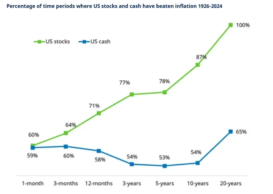 Beinahe 100 Jahre US-Börsendaten zeigen: Wer nur einen Monat investiert, schlägt die Inflation in 60 Prozent der Fälle. Bargeld schafft das genauso oft – kein Vorteil für Aktien. Aber je länger man investiert bleibt, desto besser wird es: Nach einem Jahr gewinnen Aktien in 70 Prozent aller Fälle gegen die Inflation. Nach fünf Jahren: 80 Prozent. Nach zehn Jahren: fast 90 Prozent. Und hier kommt für Lamont das entscheidende Argument: «In keinem einzigen 20-Jahres-Zeitraum haben Aktien gegen die Inflation verloren.»