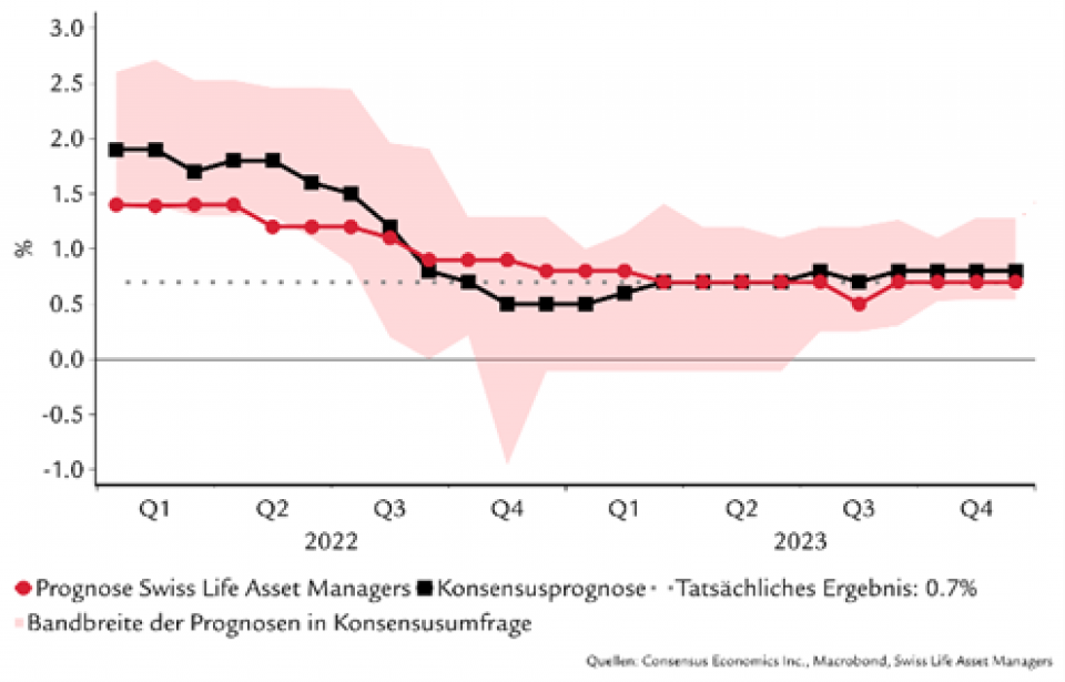 Für 2024 rechnet Swiss Life Asset Managers damit, dass die Weltwirtschaft Mitte Jahr eine zyklische Talsohle erreichen wird. Für die Schweiz bedeutet das eine Erholung des Bestellungseingangs in der Industrie und ein erwartetes Wachstum des Bruttoinlandprodukts von 1.2%. Per Anfang April 2024 lag die Prognose zur durchschnittlichen Inflationsrate bei 1.2%.
