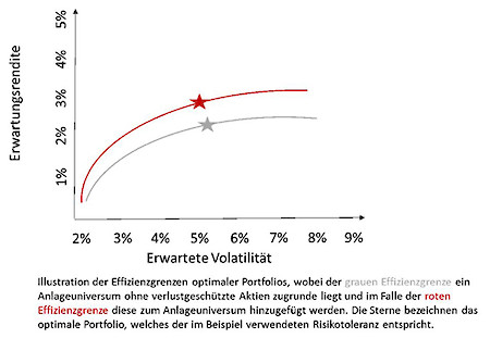 Insbesondere in Zeiten von sehr niedrigen Renditeerwartungen sorgen verlustgeschützte Aktienstrategien bei Anleihen für höhere risikoadjustierte Erwartungsrenditen und eine nochmals breitere Diversifikation. Sie erlauben eine zielgenaue Steuerung des Aktienrisikos und dadurch eine Optimierung des Risiko-Rendite-Profils sowie namentlich bei Versicherungsgesellschaften - der regulatorischen Kapitalhinterlegung. Die Umschichtung in Aktien wird möglich, ohne dass das durchschnittliche Portfoliorisiko signifikant steigt. Das heisst, dass die Effizienzgrenze des Portfolios angehoben wird. Ganz gleich, welche Risikotoleranz ein Investor hat, er gelangt zu einer besseren Kompensation für das eingegangene Risiko (vgl. Grafik).