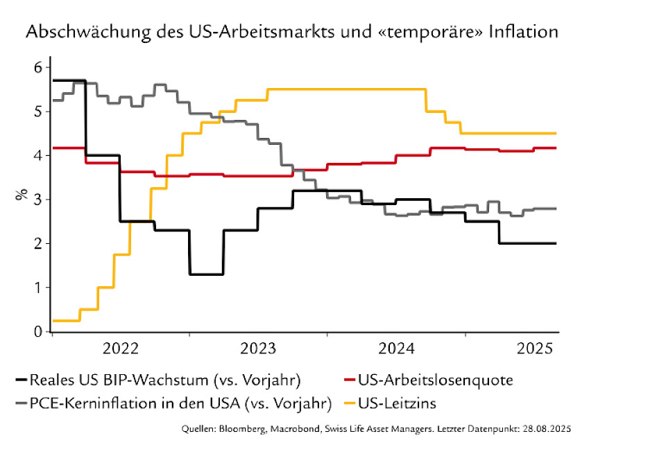 Im August 2024 signalisierte die sogenannte «Sahm-Regel» den Beginn einer US-Rezession, da die Arbeitslosigkeit deutlich gestiegen war. Darauf folgte das Fed mit «Absicherungszinssenkungen» um 100 Basispunkte. Swiss Life Asset Managers stellt fest, dass gegenüber vor einem Jahr die US-Zölle zu höheren Inflationserwartungen am Markt geführt haben (z. B. notiert der zehnjährige USD-Inflationsswap bei rund 2,6%) und das BIP-Wachstum abflaut und sich der Arbeitsmarkt verschlechtert.