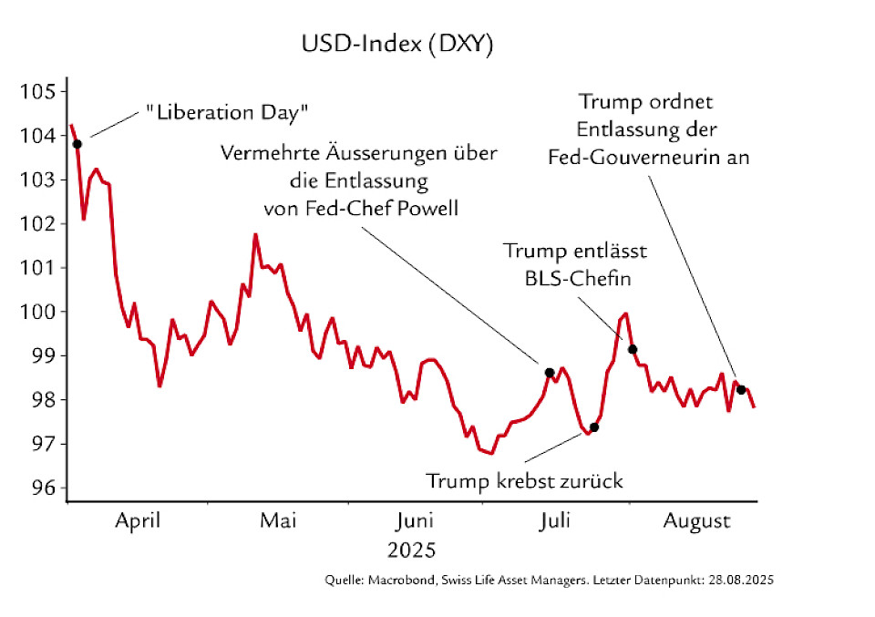 Die Vertrauenskrise rund um die Unabhängigkeit von US-Institutionen eskalierte im August weiter. Die Spannungen verschärften sich nach der Entlassung der Chefin des Bureau of Labour Statistics (BLS), nachdem der US-Präsident das BLS wiederholt ohne Beweise der «Manipulation» von Wirtschaftsdaten bezichtigt hatte. Die Lage spitzte sich mit der versuchten Entlassung von Fed-Gouverneurin Lisa Cook zu, was erneut Zweifel an der künftigen Unabhängigkeit des Fed weckte.