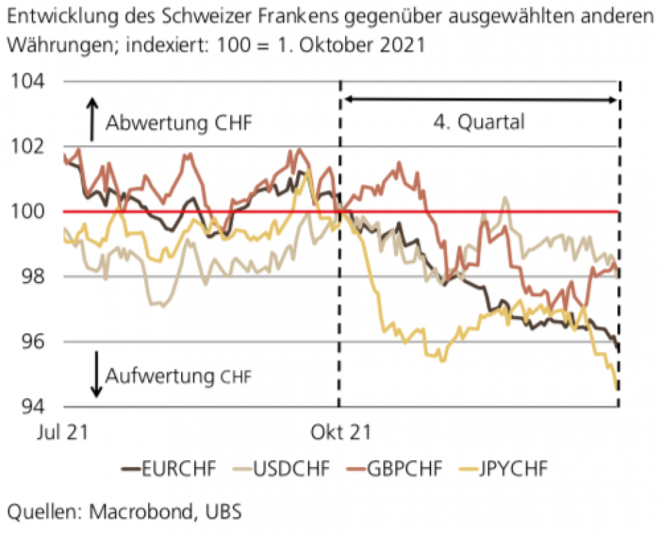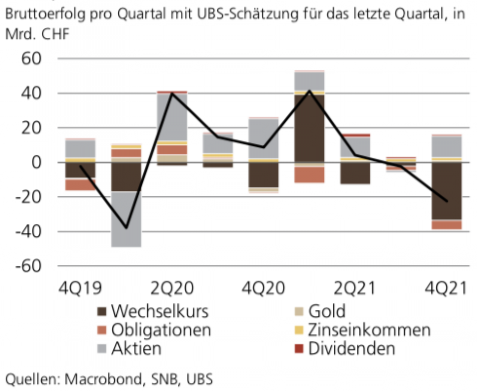 Die SNB dürfte laut UBS für das Gesamtjahr 2021 einen Gewinn von fast 20 Mrd. Franken ausweisen. Dieser ist einer starken Aktienmarktperformance zu verdanken trotz belastender Zins- und Währungsveränderungen. Im letzten Quartal hingegen dürfte die Nationalbank wegen der deutlichen Aufwertung des Frankens gegenüber den meisten Währungen einen Verlust von über 20 Mrd. Franken erlitten haben.