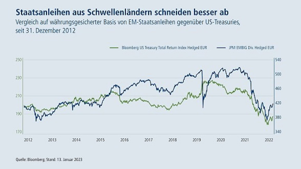 Grundsätzlich haben in den vergangenen Jahrzehnten in Euro oder US-Dollar denominierte Staats- und Unternehmensanleihen aus Schwellenländern einen beträchtlichen Mehrertrag gegenüber heimischen Staats- und Unternehmensanleihen abgeworfen – unterbrochen von periodisch auftretenden Krisen. Das Jahr 2022 machte da keine Ausnahme: «Ein Gebräu aus geopolitischen Spannungen, weltweit steigender Inflation, massiven Leitzinsanhebungen der Notenbanken in den USA und Europa und der darauf folgenden Wachstumsabschwächung führte zu deutlichen Kursverlusten bei Hartwährungsanleihen aus Schwellenländern», schreibt Union Investment.