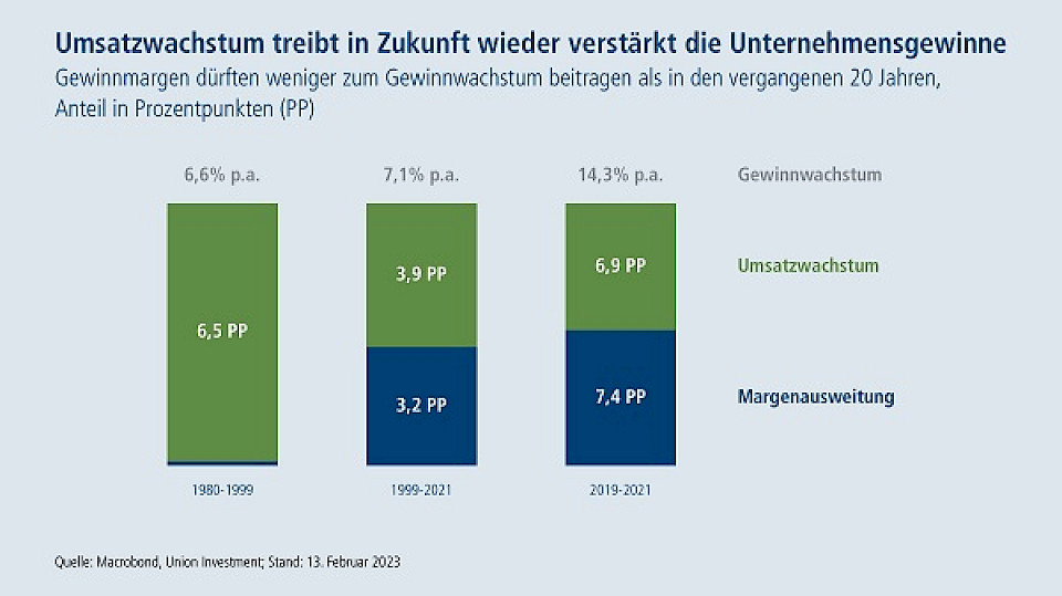 Aufgrund des strukturell höheren Zinsniveaus klettern auch die Kapitalkosten. Die Folge: Die Gewinnmargen der Unternehmen dürften grundsätzlich niedriger ausfallen als zuletzt. Anders als in den vergangenen 20 Jahren werde das Umsatzwachstum wieder zum dominanten Treiber für Gewinne – wie es auch in den drei Dekaden vor 2000 der Fall war.