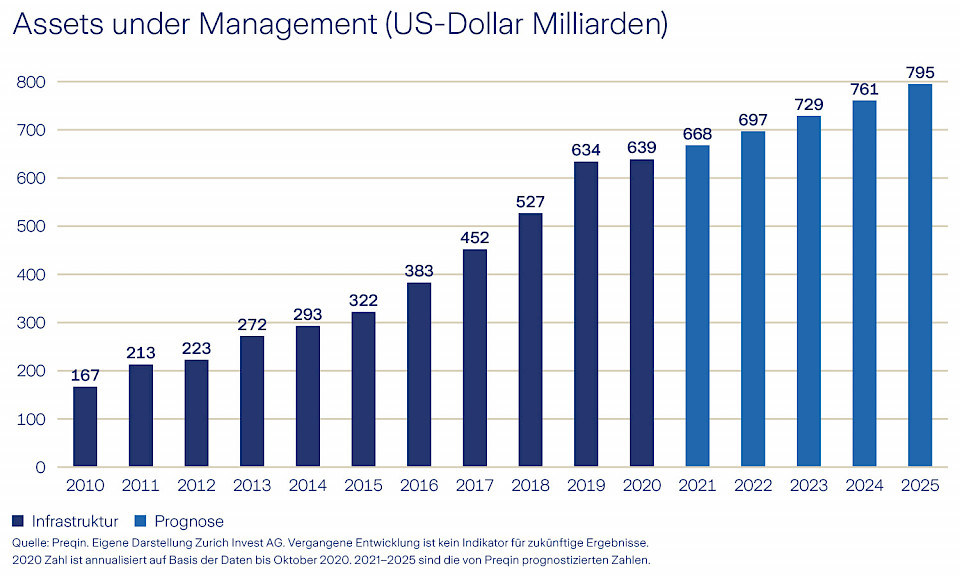 Bei den international verwalteten Vermögen stellten nach Angaben des Londoner Datenanbieters Preqin Investitionen in Infrastrukturprojekte in den vergangenen zehn Jahren das am stärksten gewachsene Privatmarktanlagensegment dar. In diesem Zeitraum haben sich diese Investitionen fast vervierfacht. Im letzten Herbst erreichten sie eine Höhe von 639 Mrd. US-Dollar. Die Zahl der nicht börsennotierten Infrastrukturfonds, die im Juli 2021 auf dem Markt waren, ist seit Jahresbeginn um satte 25% gestiegen. Damit wurde ein neuer Höchststand erreicht. Insgesamt waren es 328 Fonds, die ein Gesamtkapital von 238 Mrd. US-Dollar anstrebten.