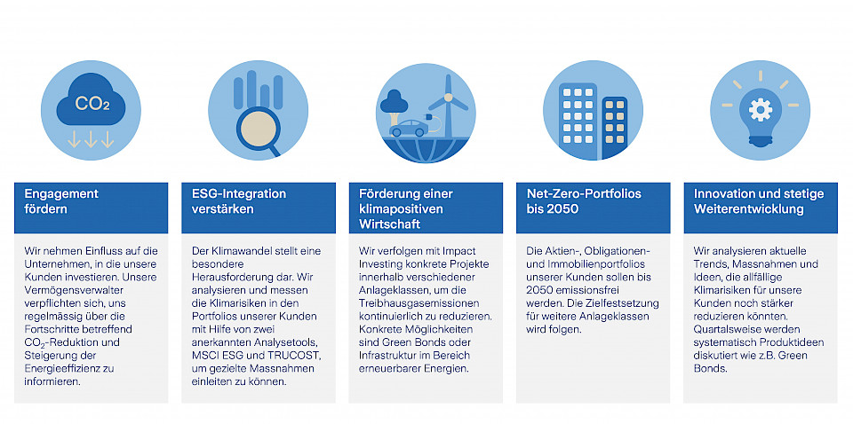 Um den Klimawandel im eigenen und im Anlageansatz externer Vermögensverwalter zu berücksichtigen, hat die Zurich Invest AG als 100-prozentige Tochtergesellschaft der Zürich Versicherungs-Gesellschaft AG und Geschäftsführerin der Zürich Anlagestiftung eine klare Strategie definiert. Darin hat sie sich zu Massnahmen in fünf Bereichen verpflichtet (siehe auch Grafik).